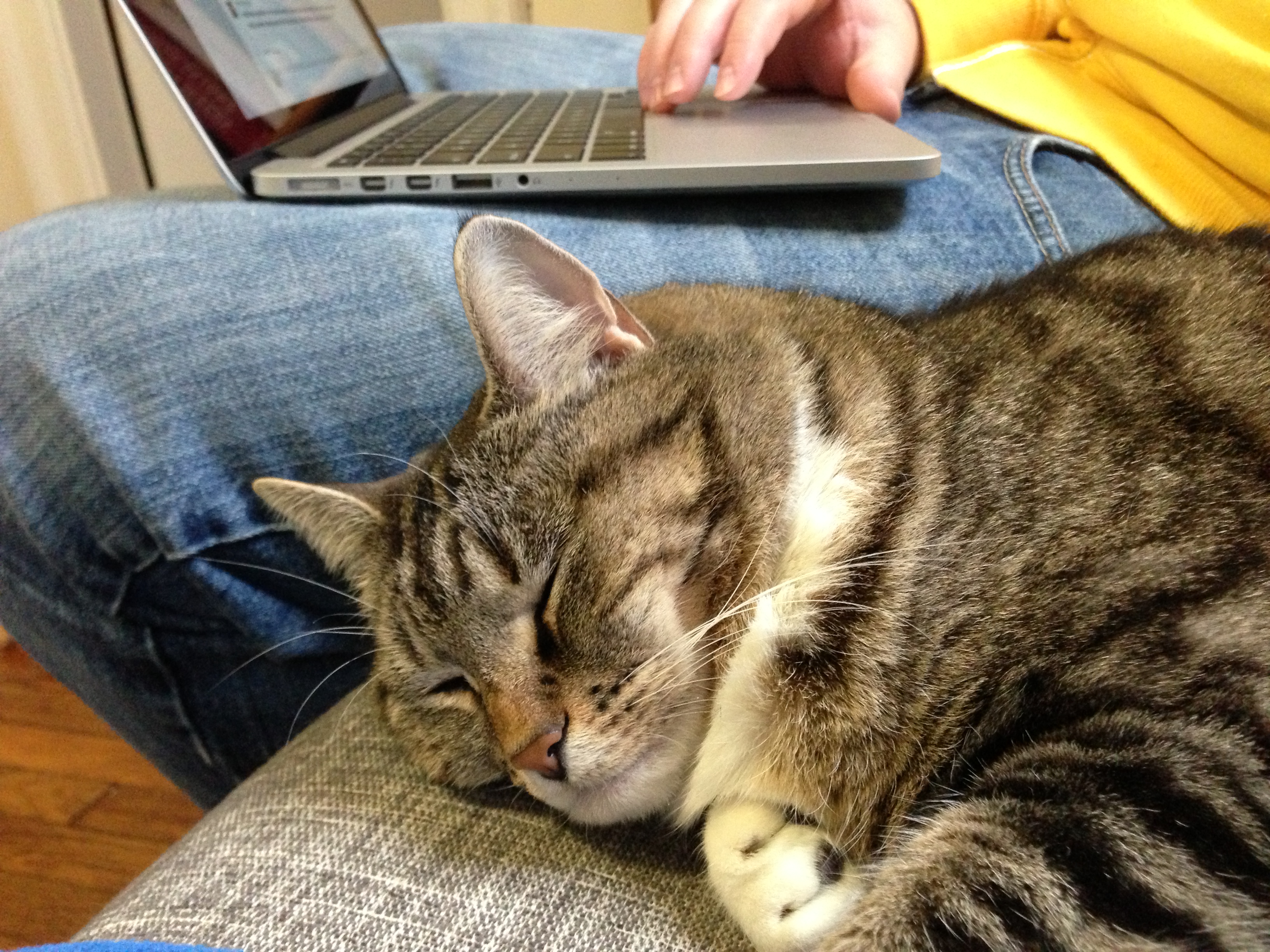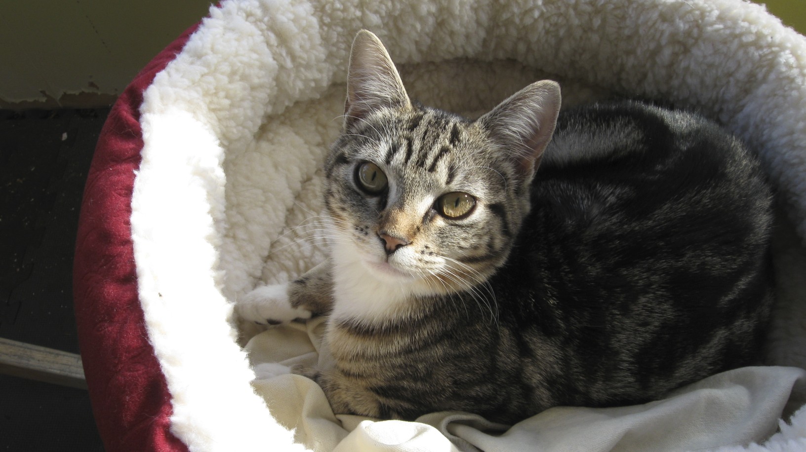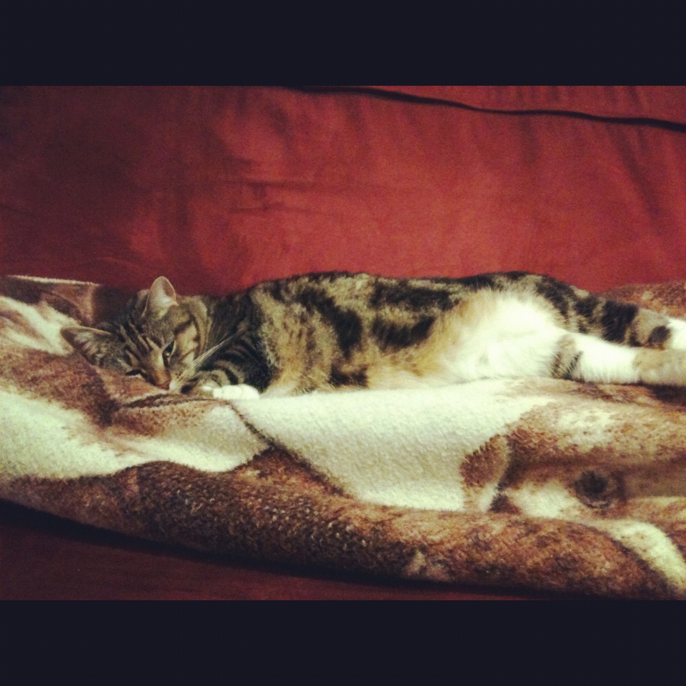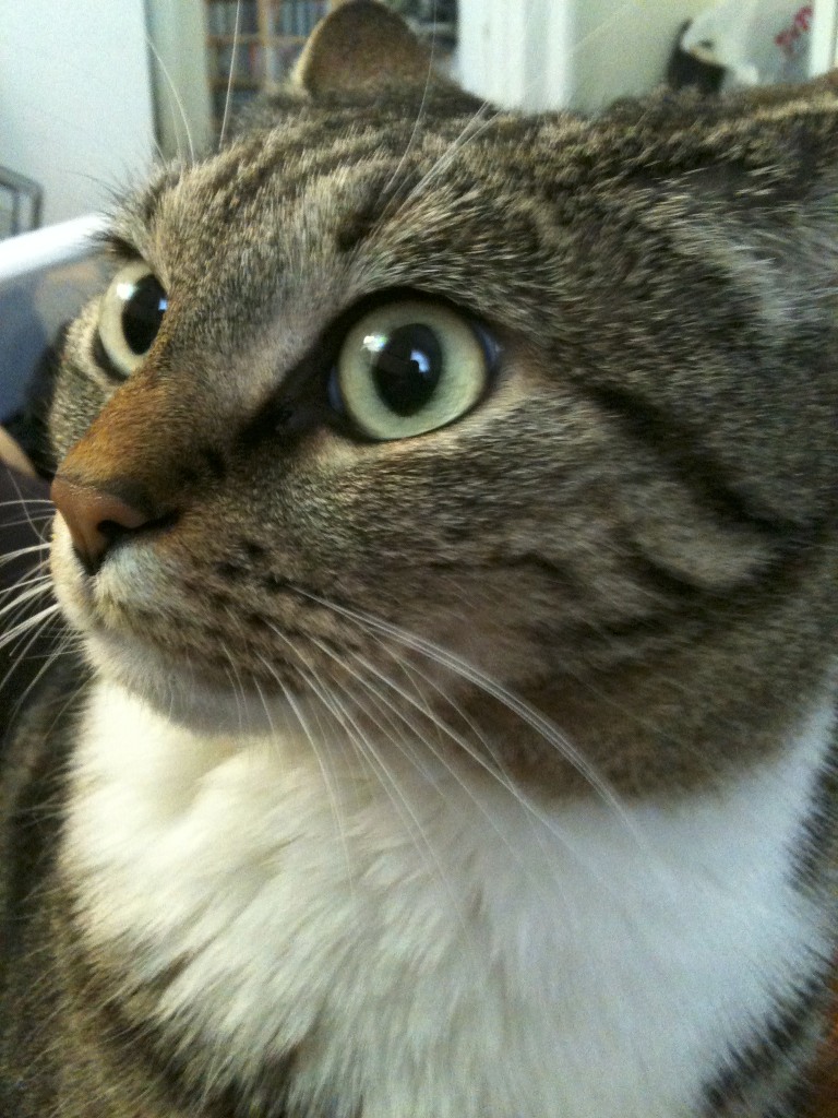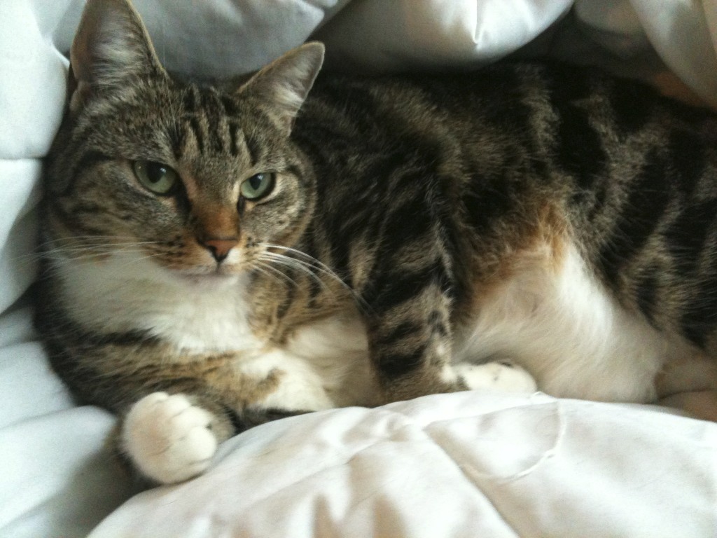 Dolce is a seven-year old female indoor calico that we adopted as a kitten from the MSPCA in Jamaica Plain in November 2008.  She has a clean bill of health and is up to date on all her shots.  Hence the name, she is actually a very sweet and cuddly cat who will curl up in warm laps. She can be a little shy when meeting new people and would do best in a home with older kids (or really patient young ones) and without other pets. She enjoys bird-watching from the window, napping in boxes, playing with toys on strings, and chowing down on her favorite Grilled Salmon Dinner by Fancy Feast.  As an added bonus, she is an expert mouse catcher (in our old apartment). Dolce – 3  Mouse – 0   If you know someone looking to adopt a cat, please let us know.